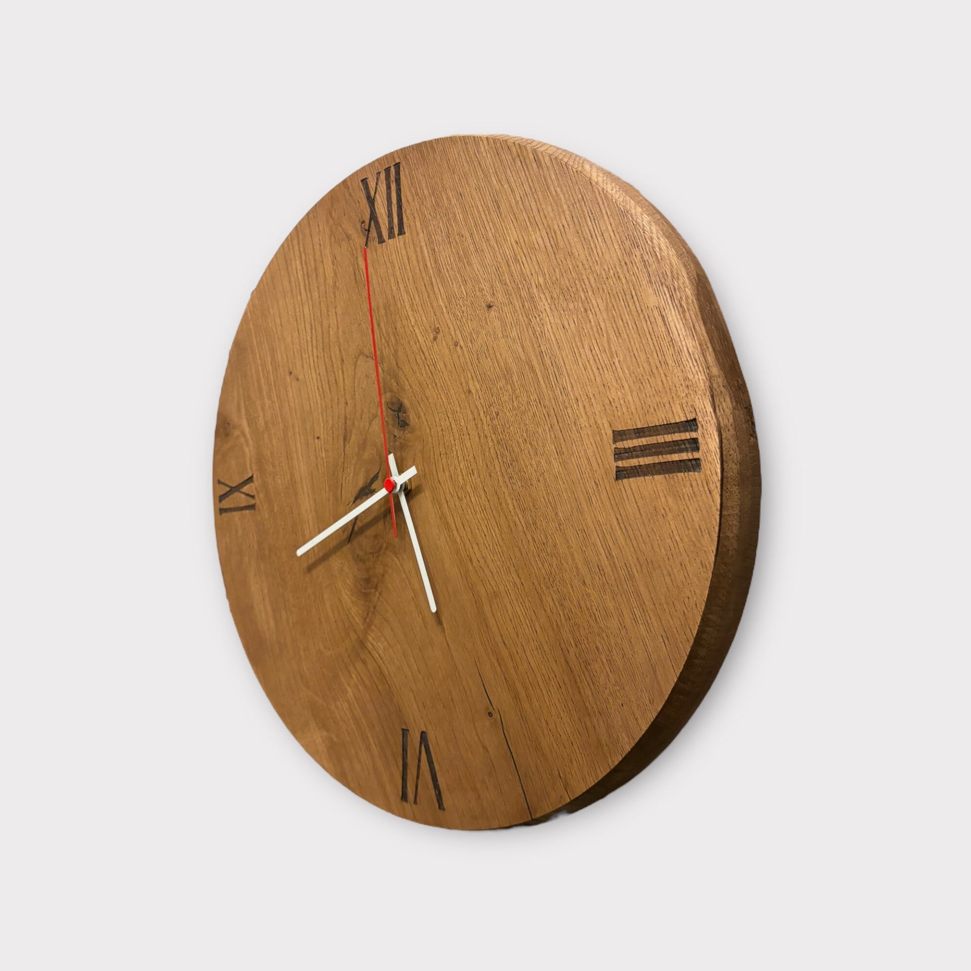 Handgefertigte Eichenholz Wanduhr mit Lasergravur-Ziffernblatt und Holzzeiger | Rustikale Eleganz | massive Naturholz-Uhr | römische Zahlen