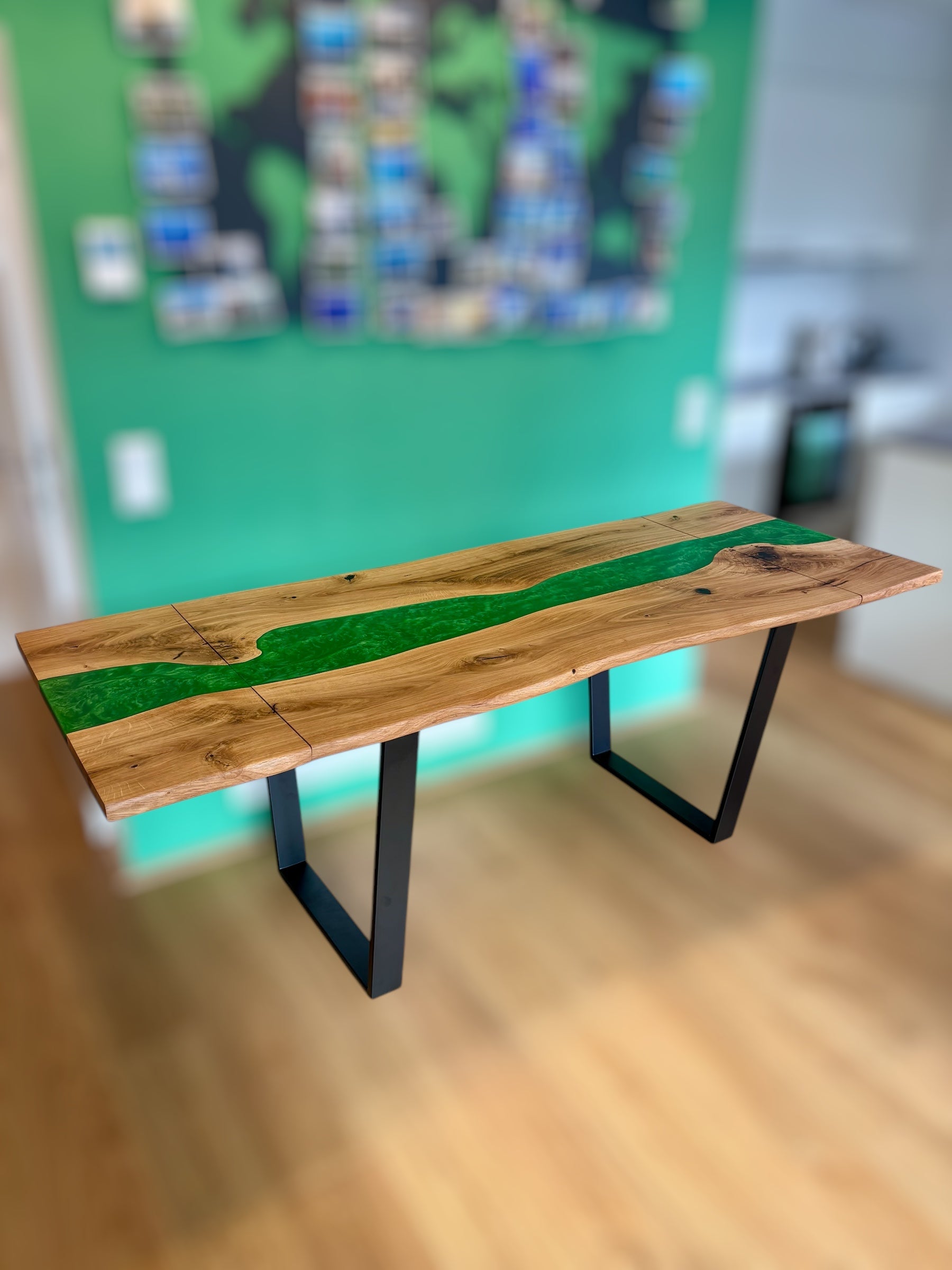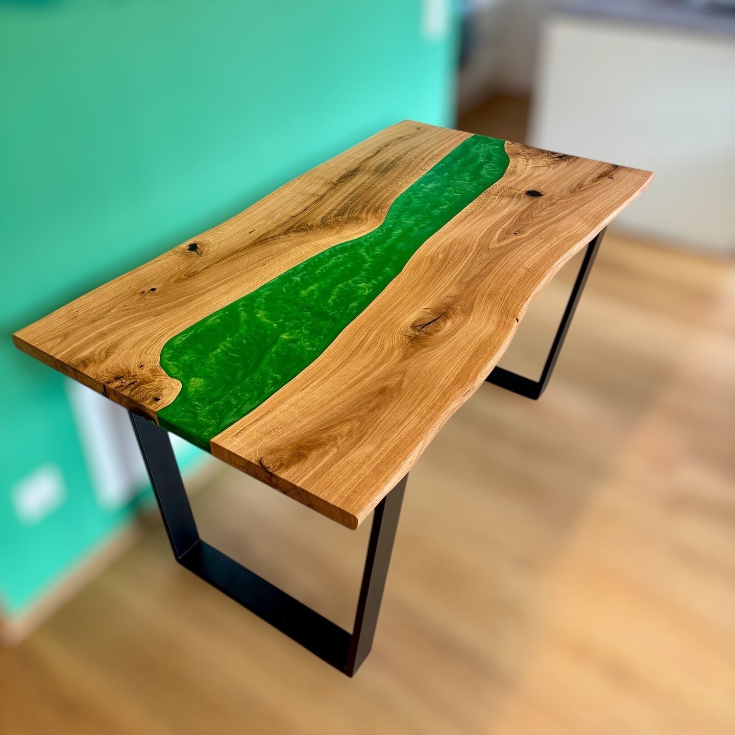 Handgefertigter Esstisch aus Eiche und Epoxidharz mit ansteckbaren Verlängerungen